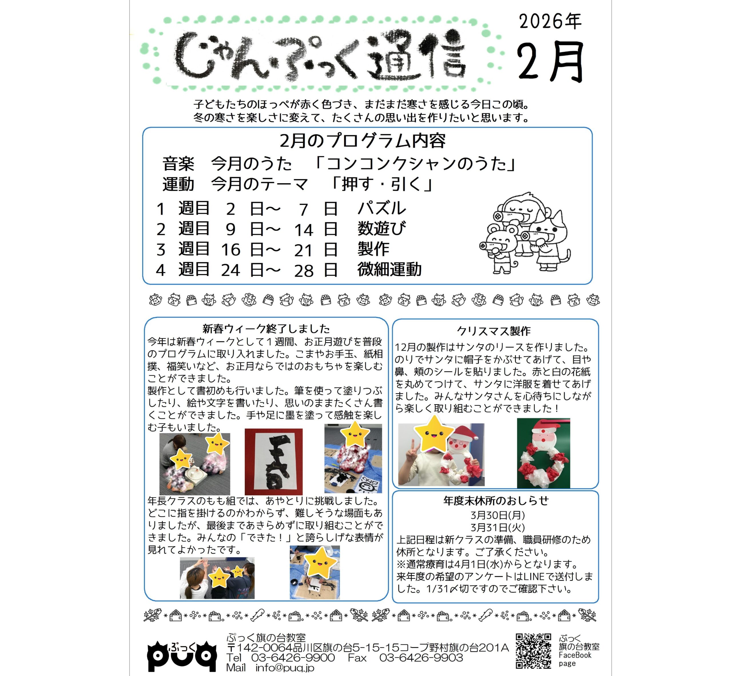 ぷっくのお知らせ2月号をお配りしています。今月のうたは、コンコンくしゃんのうたです。お友だちに見てもらう歌詞の絵カードには、かわいい動物さん達がマスク姿でくしゃみをしている様子が描かれています。風邪をひいてしまったかな? […]
