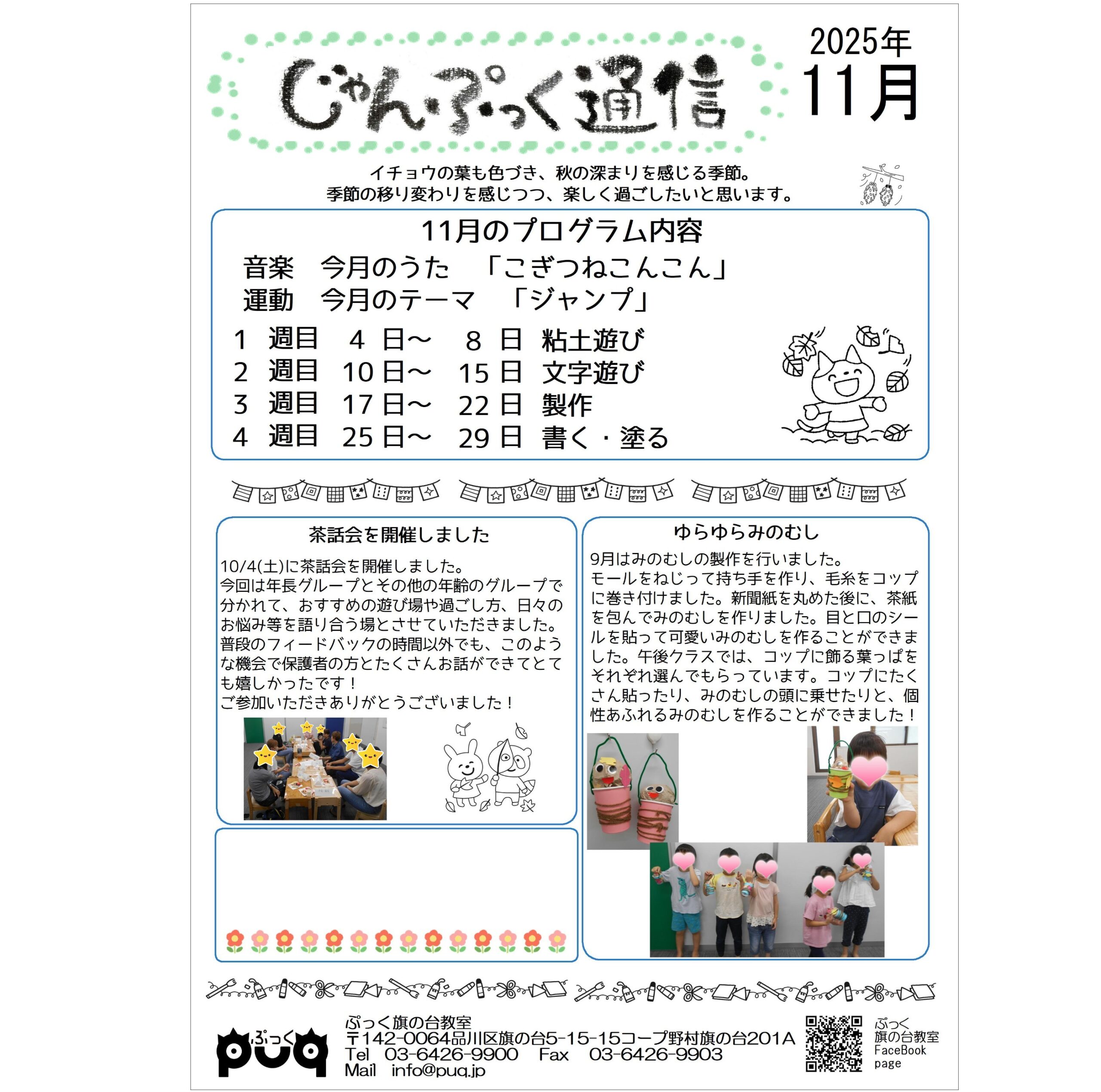 ぷっくのおしらせ11月号を配布しています。今月の歌は、こぎつねこんこん。手できつねを作れるお友だちもいますね。指を動かしながら歌うのも楽しくておすすめです。中指と薬指を親指とつけるのは、右手も左手もむずかしい!がんばれ! […]